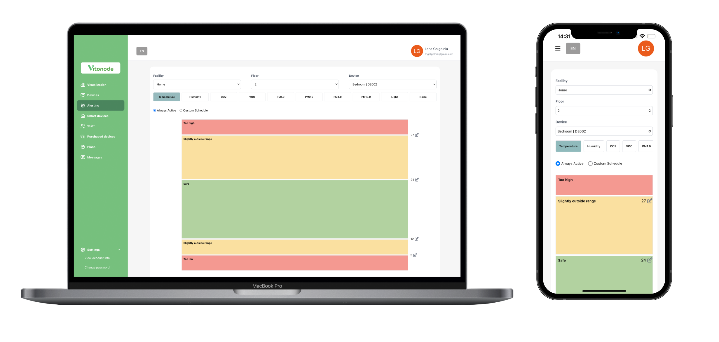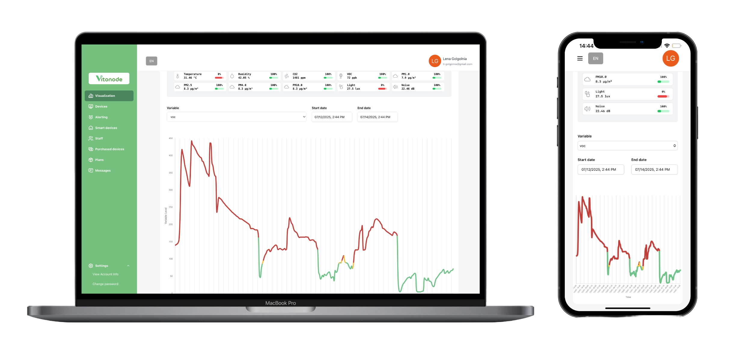 Mit der VitoNode-Software haben Sie die Innenraumqualität Ihres Gebäudes jederzeit im Griff – basierend auf den kontinuierlich erfassten Messwerten Ihrer VitoNode-Geräte. Ob einzelne Räume, ganze Etagen oder mehrere Standorte: Alle relevanten Daten werden zentral gesammelt und anschließend analysiert – inklusive Visualisierungen, Alarmierungen und algorithmischer Auswertung. Auch die Optimierung erfolgt direkt über die Software – entweder durch konkrete Verbesserungsvorschläge oder auf Wunsch sogar durch die automatische Steuerung Ihrer vernetzten Geräte über das VitoNode-Gerät, einfach und ohne Umwege.