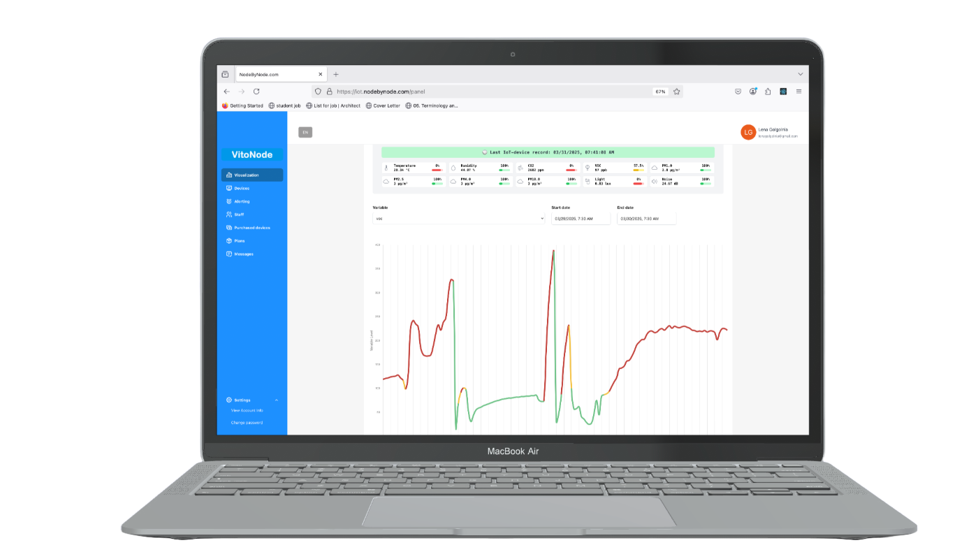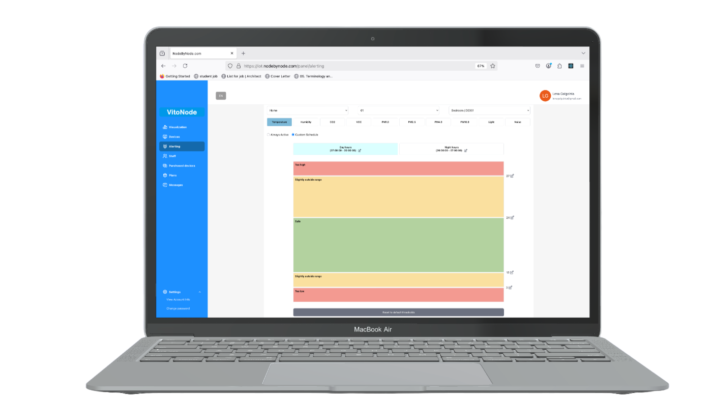 Jeder Raum ist anders – deshalb lassen sich mit Vitonode die Schwellenwerte für Temperatur, Luftqualität und andere Variablen individuell festlegen. So bleibt Ihre Umgebung stets im optimalen Bereich.